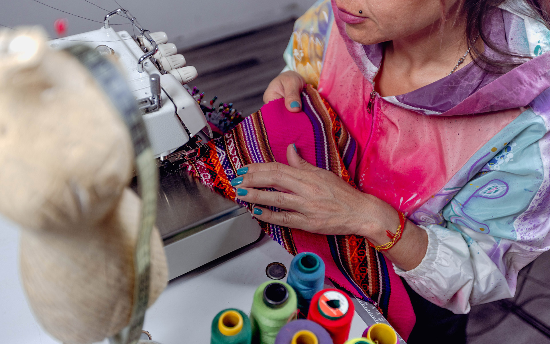 Utilizamos composiciones en telas andinas, como el tradicional "aguayo", que aportan color y autenticidad a cada diseño.